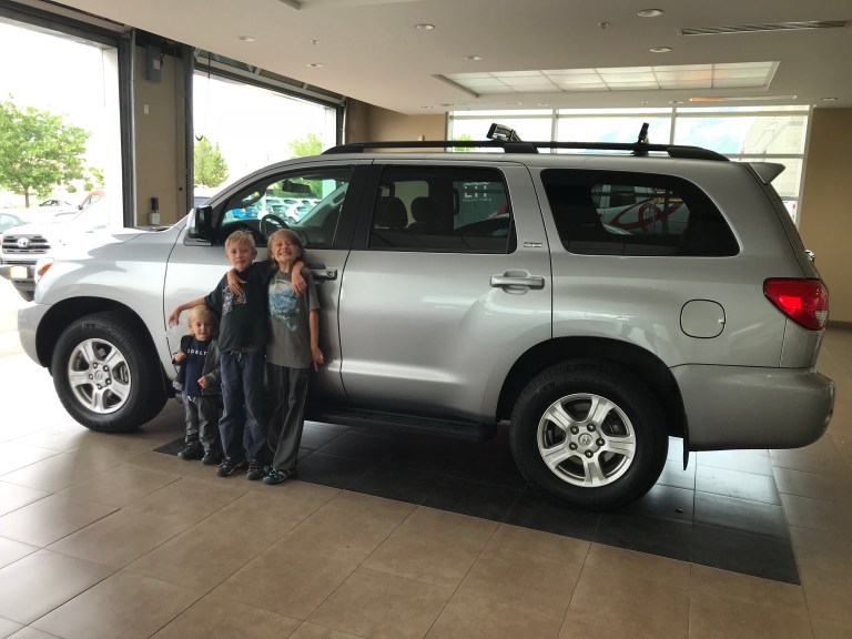 We went on a short hike with friends. It was 1 mile up and 1 mile down. It was the first tome Oliver was not carried. He did really well. About half way down he started asking to be carried. My friend carried him the last 5 minutes. Riley complained as usual. Then a few minutes in, he started calling himself a mountain goat. We had lunch by the river. It was perfect. Then off to buy a new car! Lots of road trips in our future!
